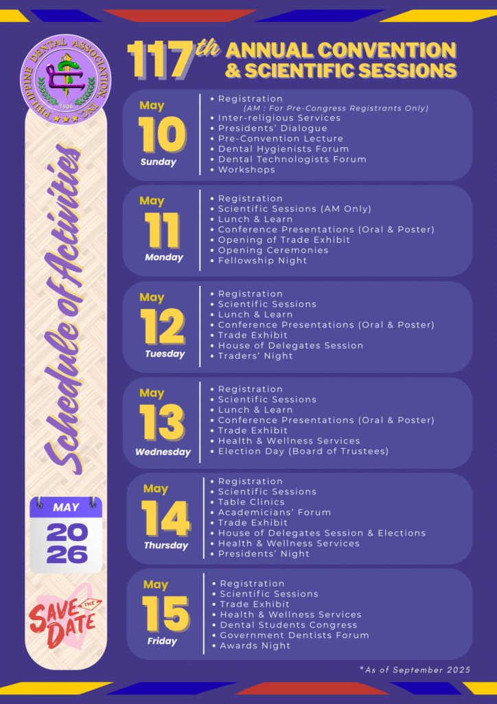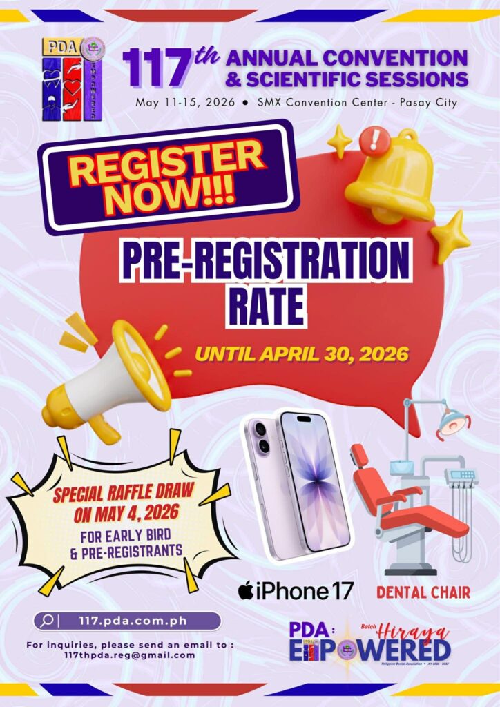 It is with great honor and heartfelt enthusiasm that I invite you to the 117th Philippine Dental Association Annual Convention and Scientific Sessions, happening on May 11–15, 2026 at the SMX Convention Center, Pasay City with the theme, “PDA : Empowered”. As your PDA President-elect and General Chairperson of this milestone event, I warmly welcome each one of you to join us in this grand gathering of dental professionals, educators, students, industry partners, and advocates of oral health. Our convention will be a celebration of excellence, innovation, and unity in our profession. It will feature world-class lectures, scientific sessions, interactive workshops, exhibits, and networking opportunities that aim to empower us in delivering the highest standards of dental care to the Filipino people. More than just a scientific assembly, this convention is a testament to our collective commitment to advancing dentistry in the Philippines and strengthening the bonds that unite us as one profession with one vision.